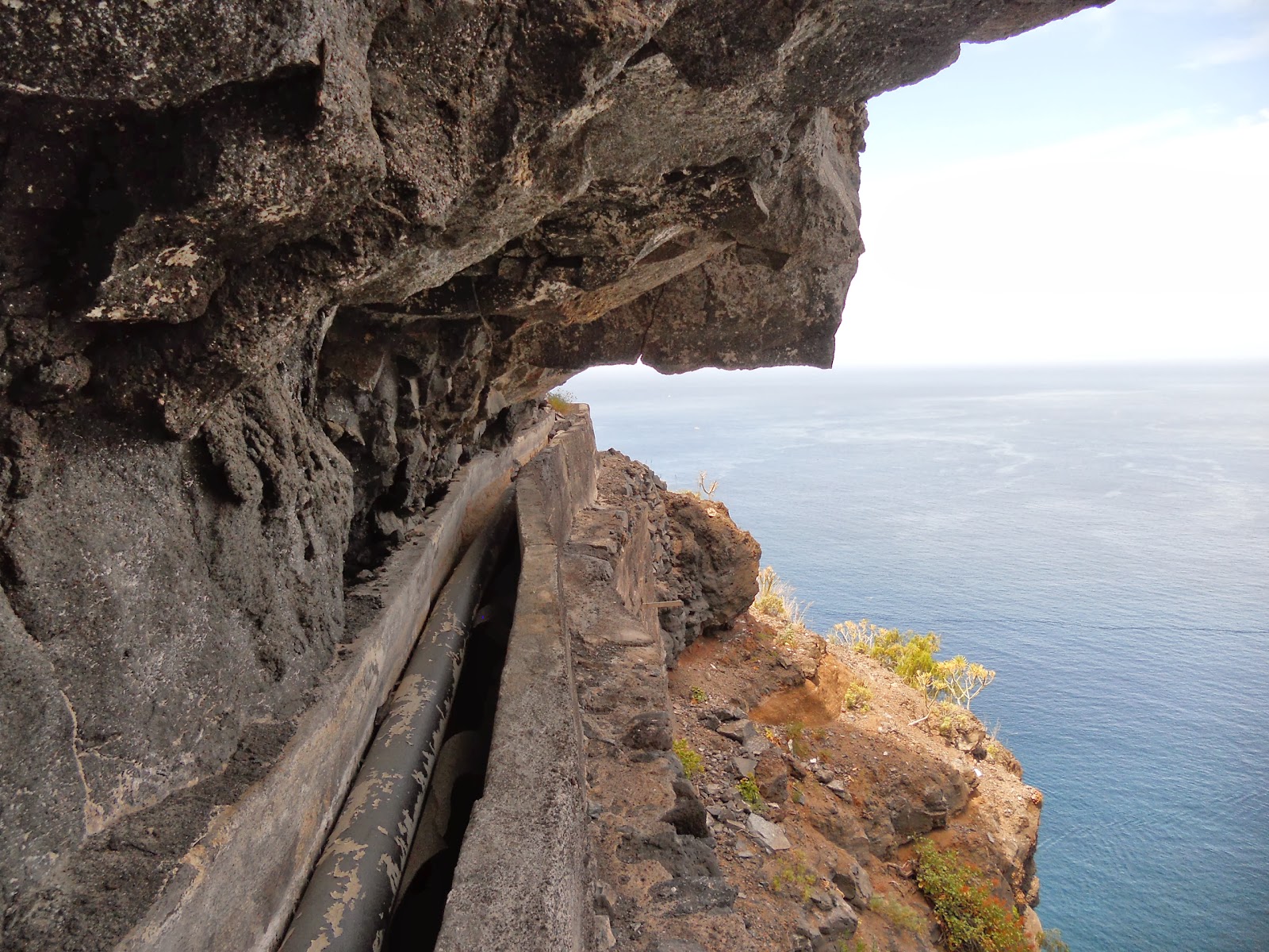 Hoy nos proponemos hacer una ruta que no está homologada, es decir, la caminata discurre por senderos que no están señalizados o balizados como tal y pueden presentar algún problema. La mayor parte del trayecto discurre paralelo a una atarjea de agua, suspendida sobre el acantilado de Los Gigantes, de cuatro kilómetros de largo, aproximadamente. En línea recta no parece tanta distancia, pero dicho canal hace múltiples recovecos en los salientes del acantilado. Las continuas caídas de piedras y tierra han partido los muretes que encauzaban el agua, por lo que se han instalado tuberías de PVC en el interior; estas conducciones también se han estropeado en algunas partes, lo que ha provocado filtraciones de agua, deslizamientos de tierra y rotura del sostén de las canalizaciones. En algunos tramos se han instalado cuerdas para salvar los tramos que se han derrumbado. Esta ruta no es aconsejable para personas con vértigo o algún otro síntoma de claustrofobia o similares. Es un sendero de alto valor paisajístico, pero bastante problemático en determinados puntos, donde se debe evaluar y decidir el mejor punto para continuar el camino. Nuestra intención es salir de Puerto Santiago caminando paralelo al canal y llegar hasta la entrada del Túnel El Natero nº5, aunque la ruta continúa hasta Masca.